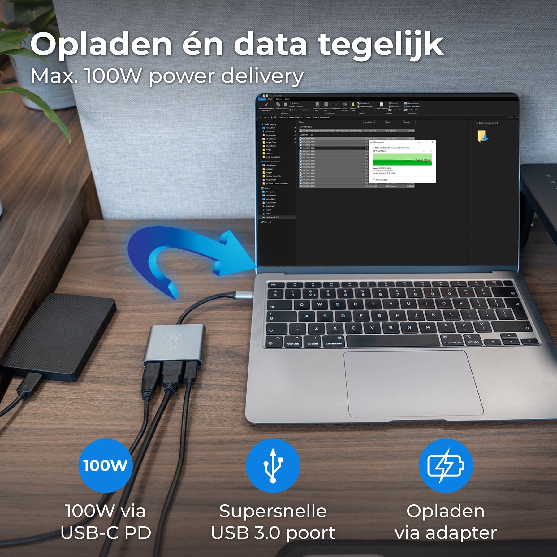 • 100W Power Delivery: laad je laptop op terwijl je werkt.