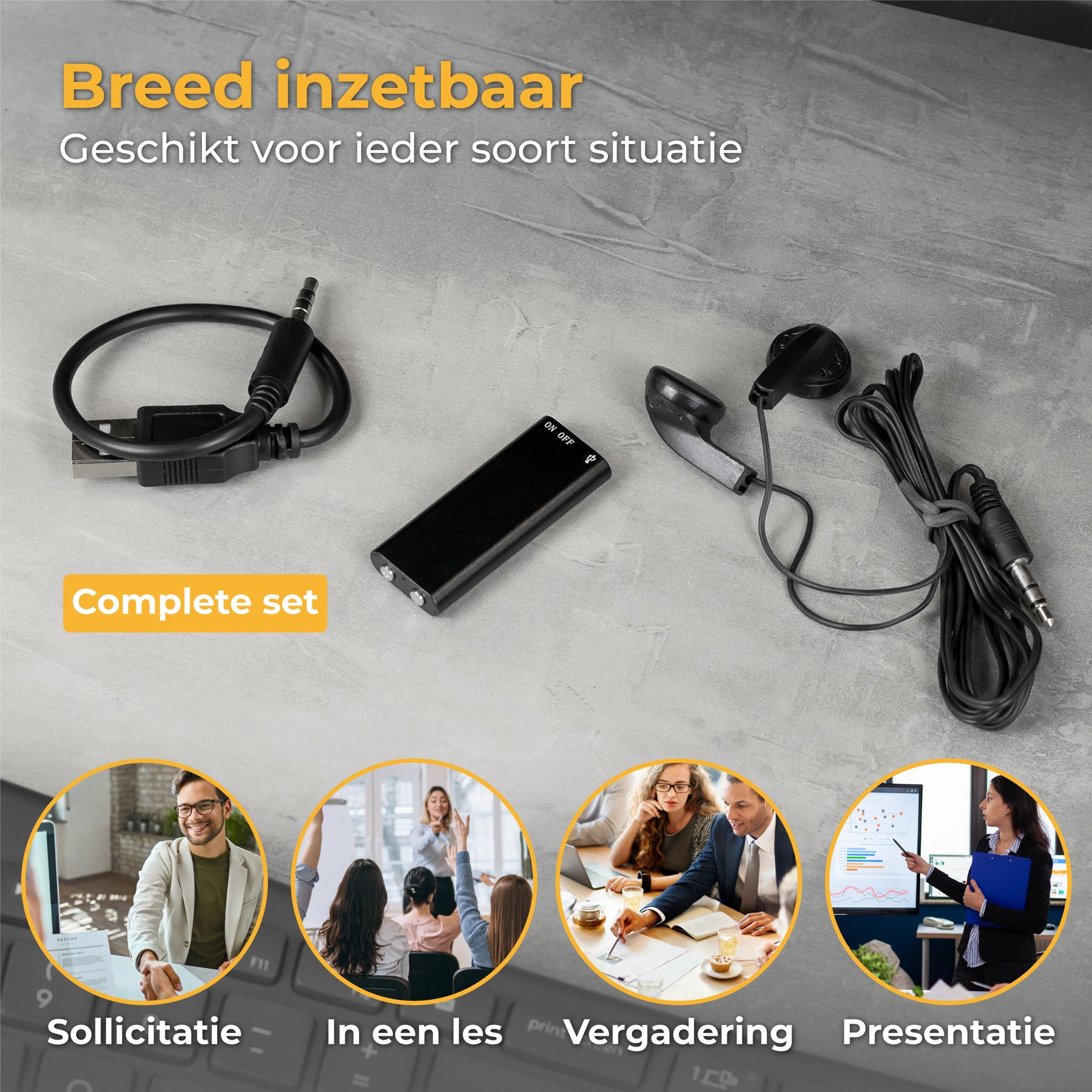 - Inclusief oortjes voor terug luisteren;
