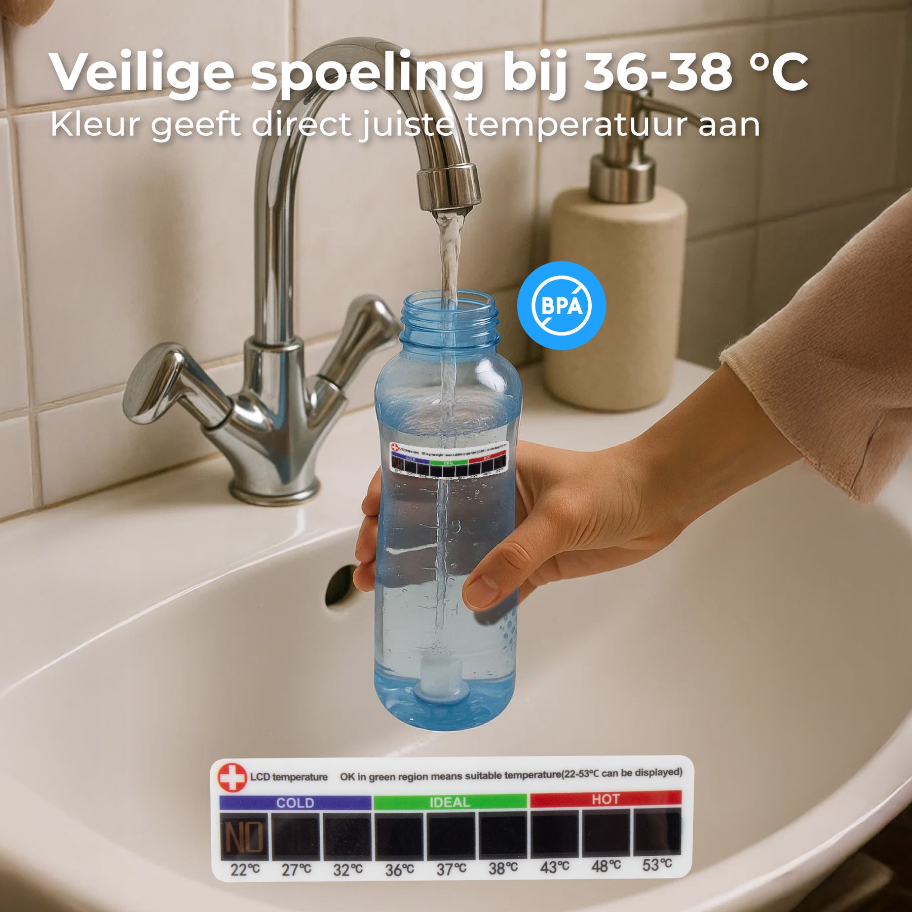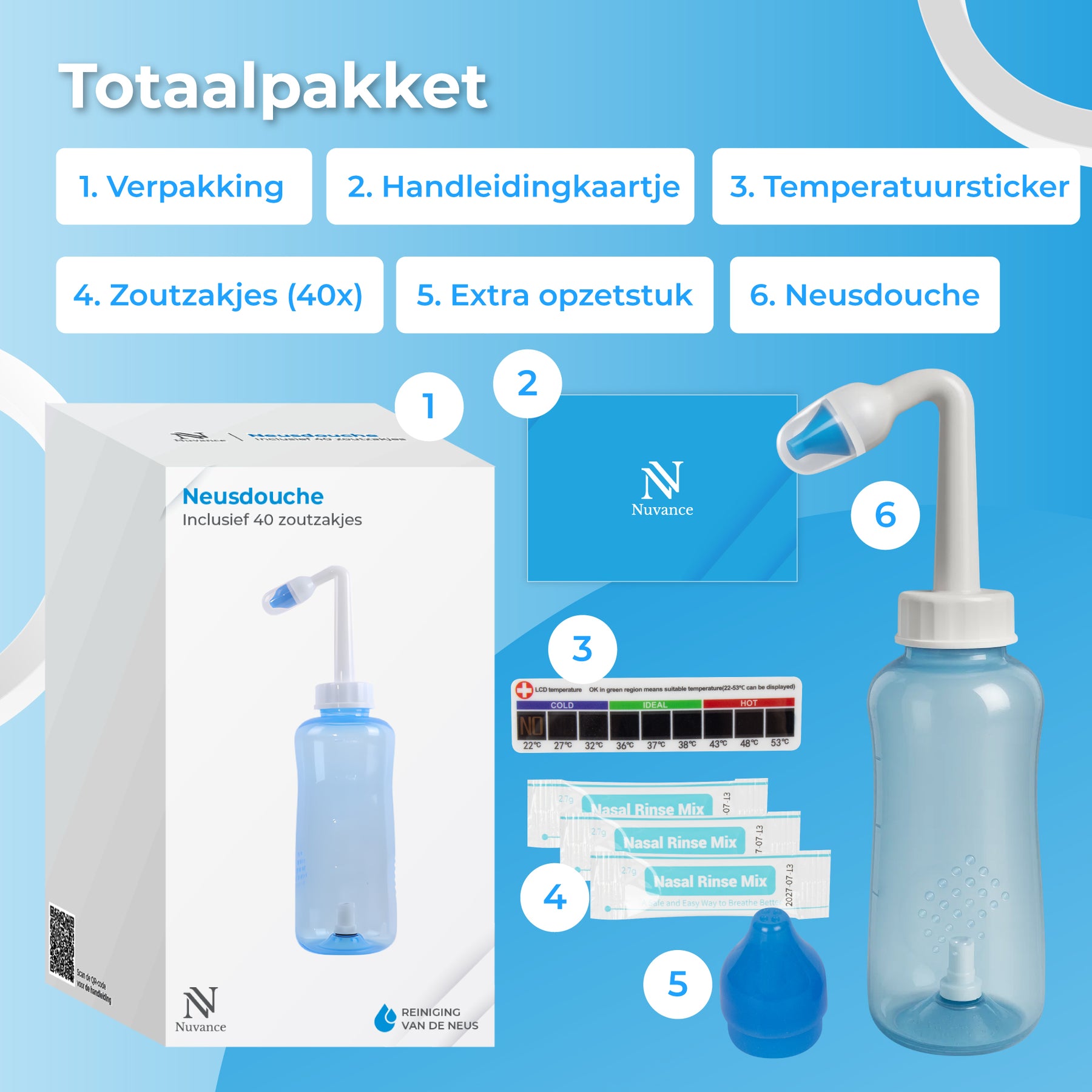 Heb je regelmatig een verstopte neus door pollen, stof of droge lucht? Dan weet je hoe vervelend dat kan zijn, vooral als je helder wilt kunnen ademen of goed wilt slapen. De Nuvance neusdouche helpt je om je neus makkelijk en snel te spoelen. Je vult het reservoir met lauwwarm water, controleert de temperatuur met de strip, en spoelt je neus schoon met één druk op de knop!
