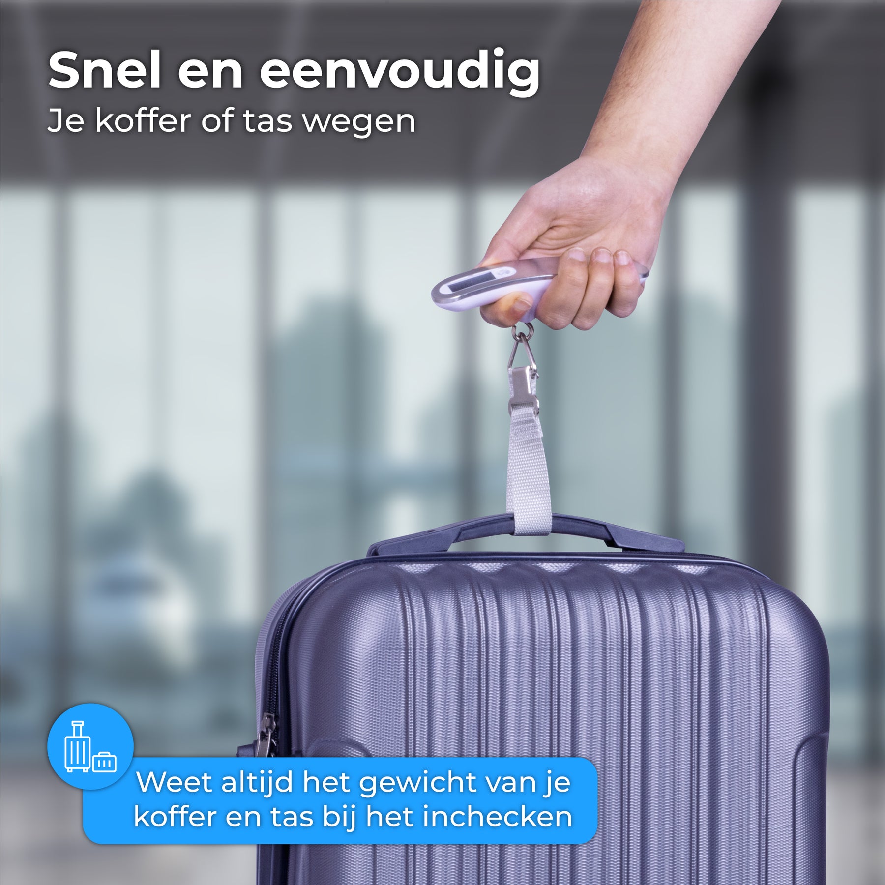 Wil je eventuele bijkomende kosten op het vliegveld voorkomen? Met de digitale kofferweegschaal van Nuvance weet je gemakkelijk en snel het exacte gewicht van je koffer!