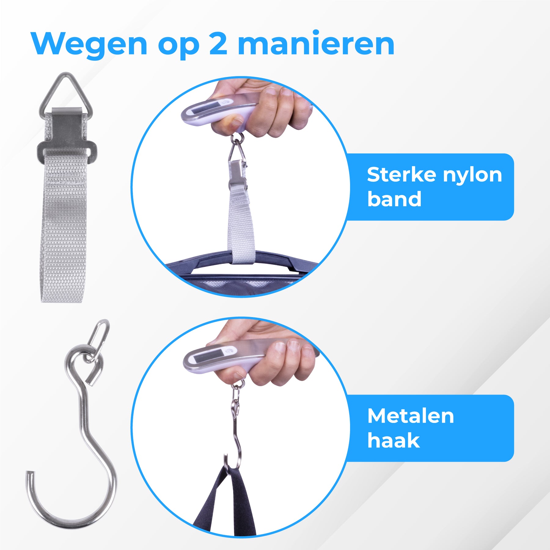 • Ergonomisch ontwerp: Comfortabele handgreep en metalen weeghaak;