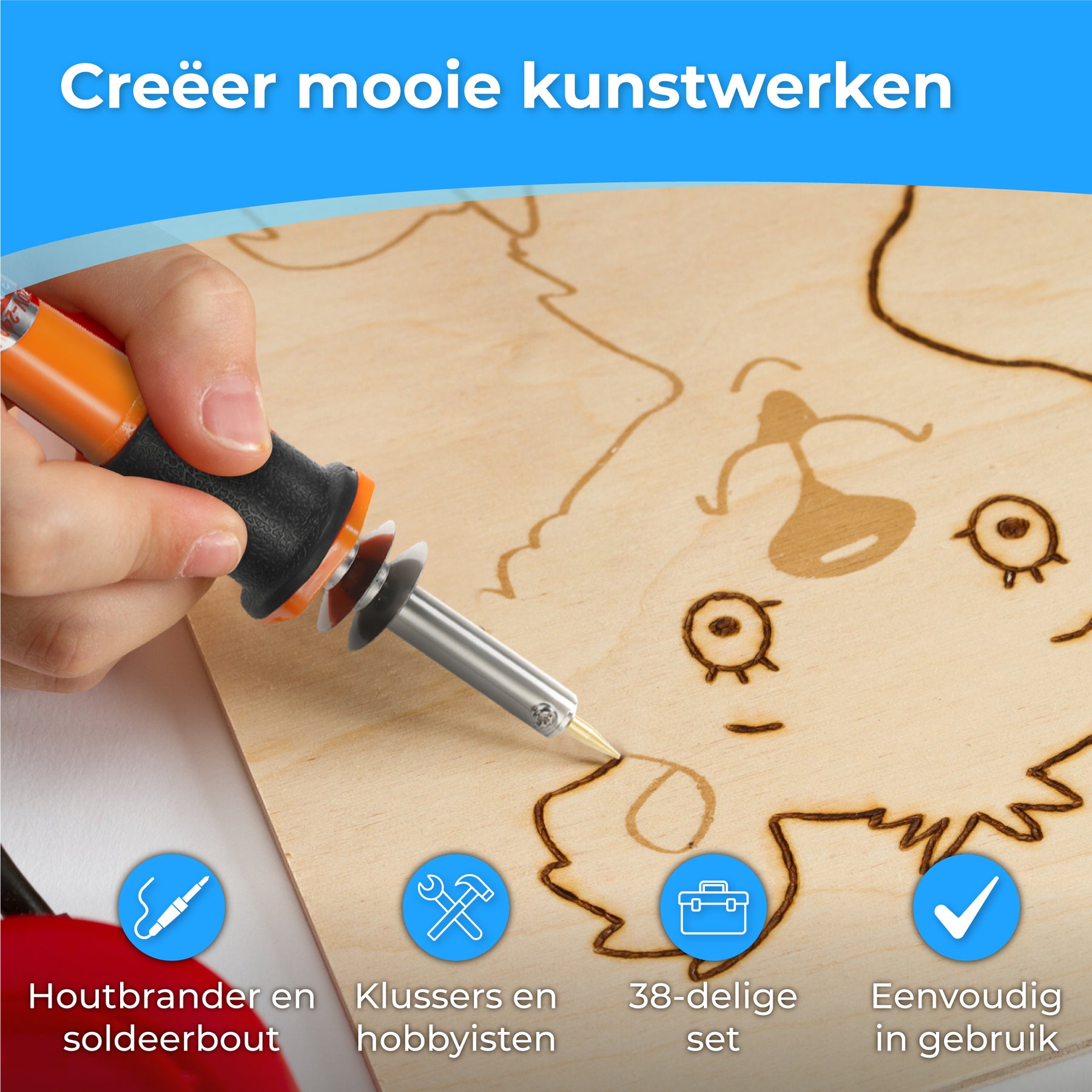 De Nuvance houtbrander is een veelzijdig gereedschap waarmee je prachtige patronen en tekeningen kunt branden op hout, leer, kurk en andere materialen. Met 34 verschillende brandpuntstukken en 2 oefen sjablonen, is deze houtbrander perfect voor creatieve hobbyisten en doe-het-zelvers.