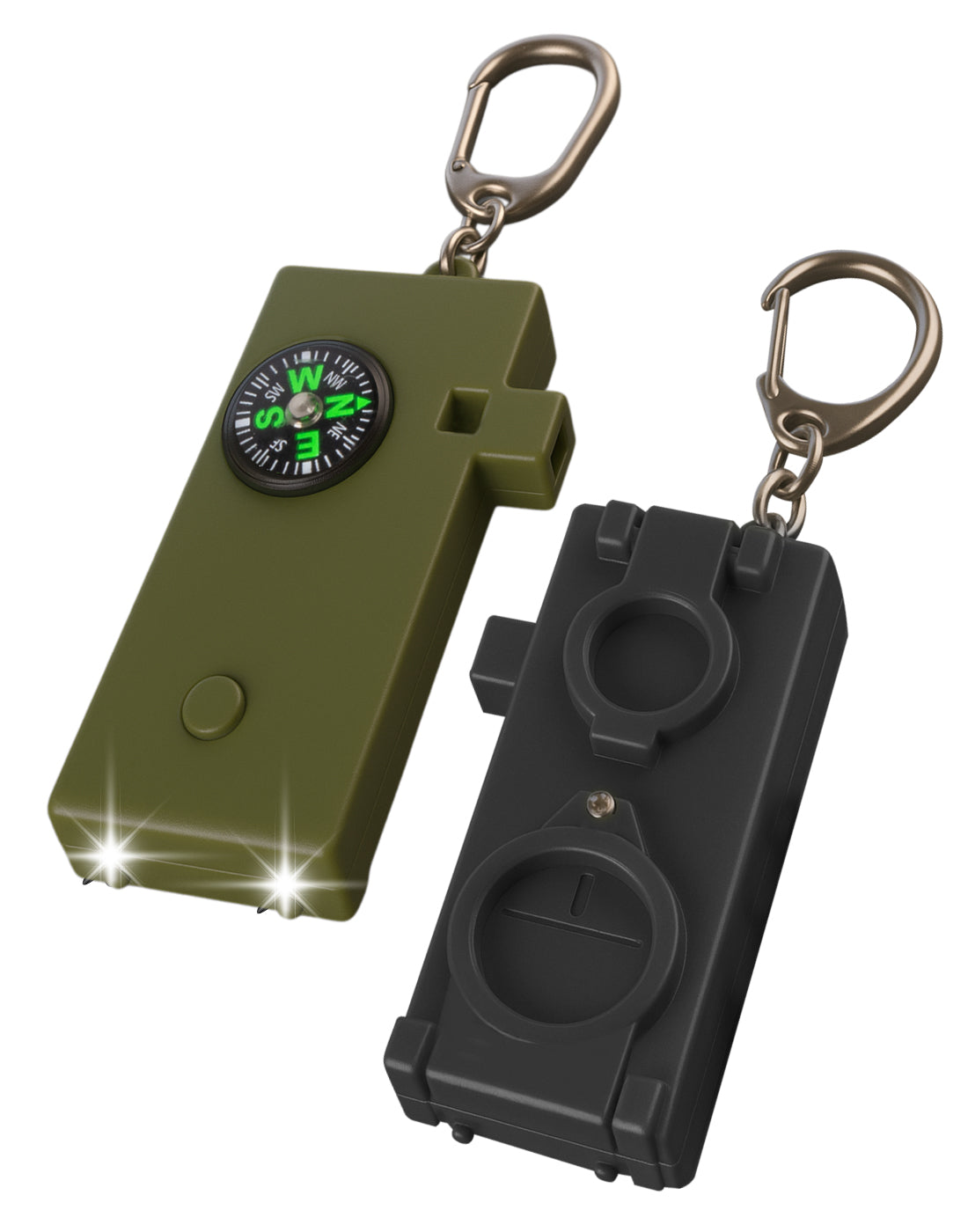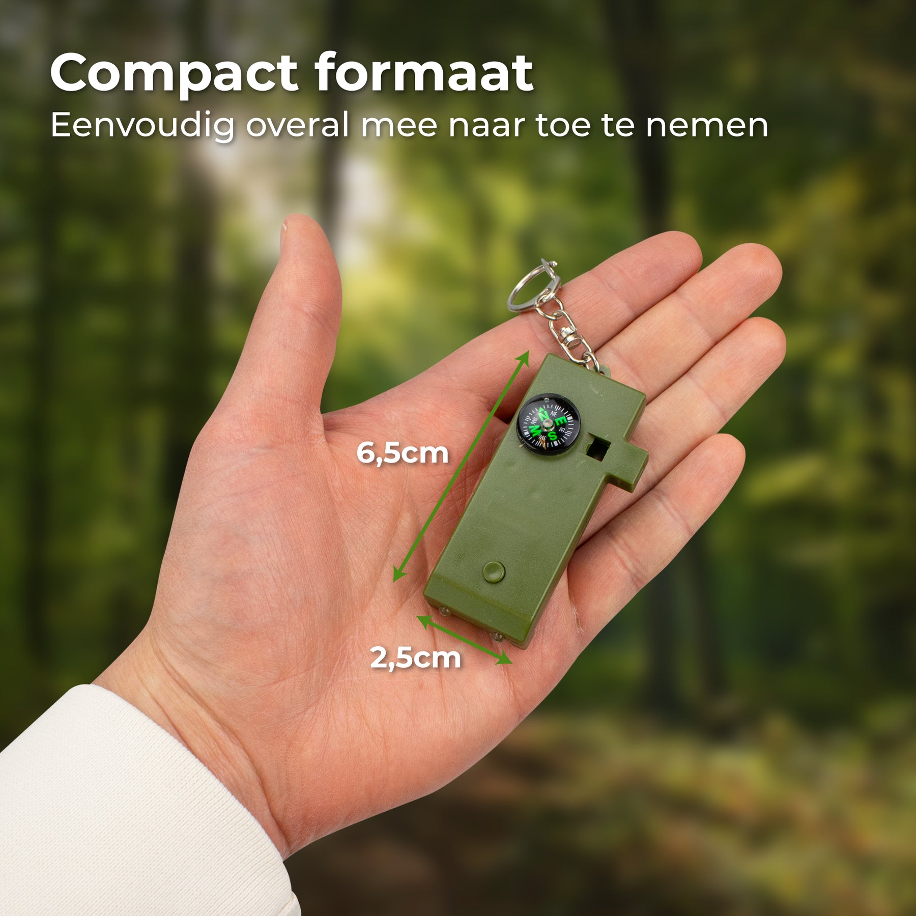 4 functies in één: noodfluit, zaklamp, kompas en brandglaasje;