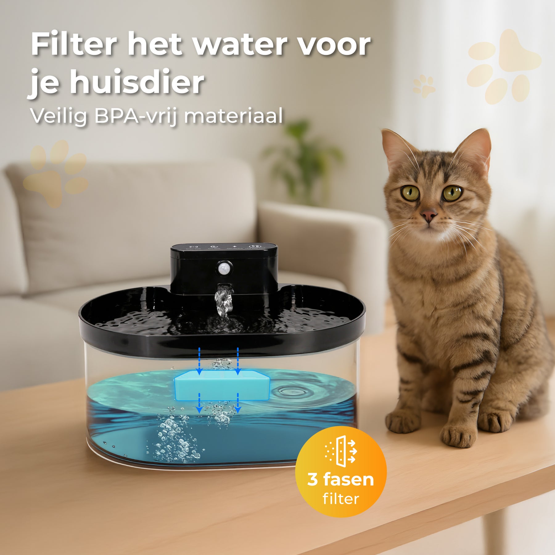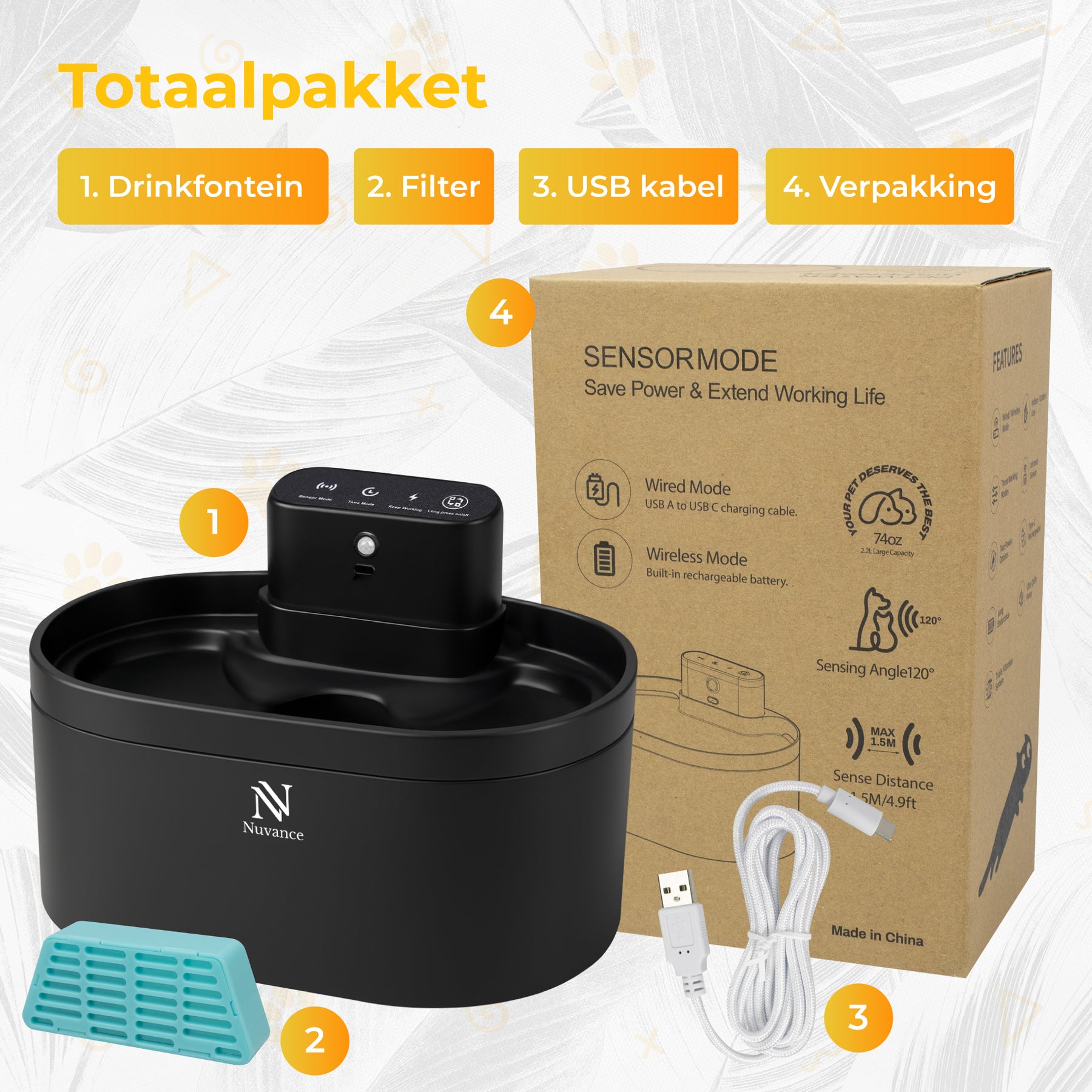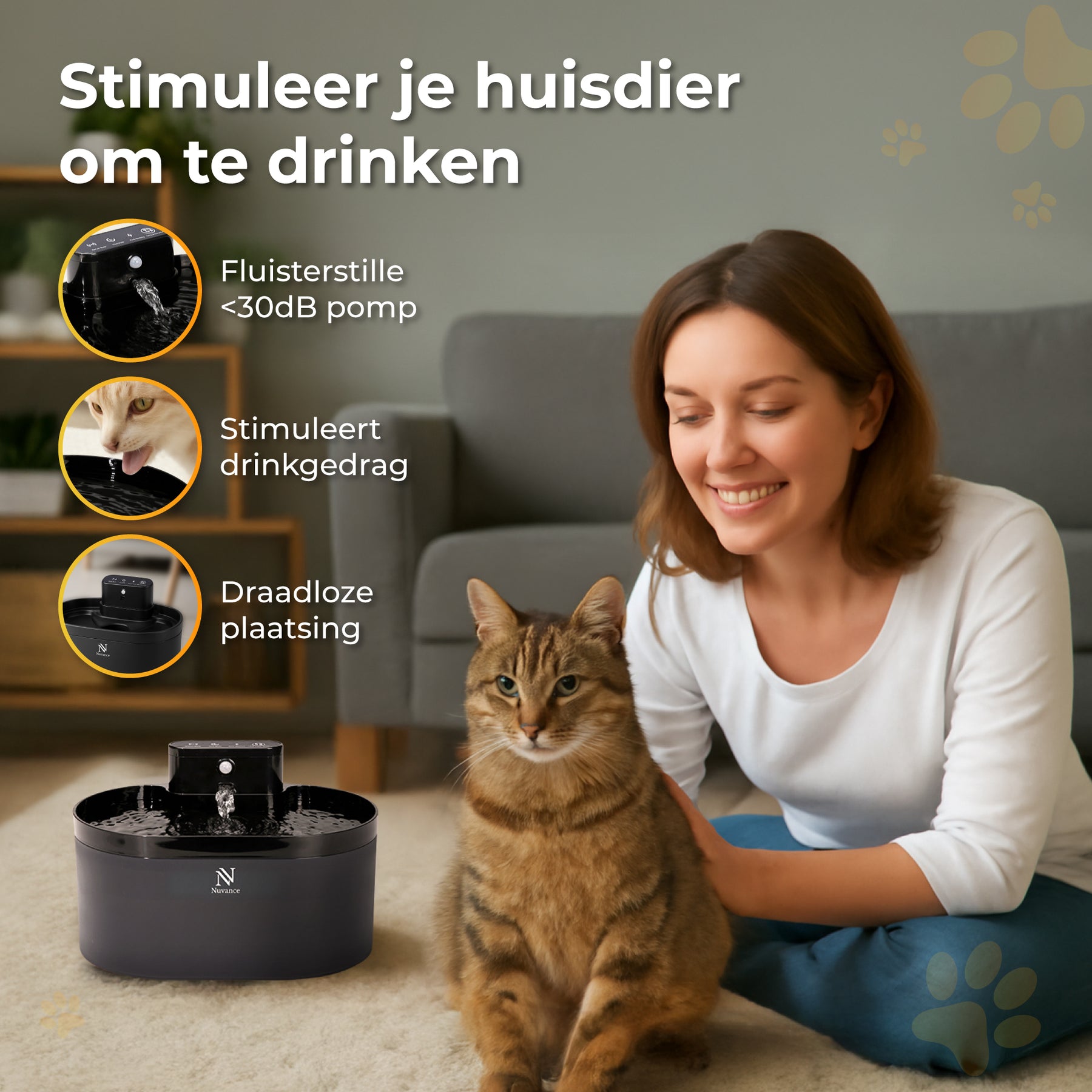 Veel dieren drinken te weinig, met gezondheidsklachten als mogelijk gevolg. De Nuvance Drinkfontein biedt een stijlvolle en slimme oplossing: automatisch stromend water dankzij een sensor, een fluisterstille werking onder de 30 dB, en een ruim 2.2L reservoir. Zo stimuleer je jouw huisdier om meer te drinken - elke dag opnieuw, zonder moeite.